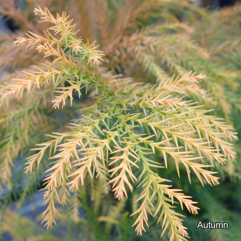 The Japanese Cedar is a lovely, small, conical conifer tree displaying colourful, evergreen foliage, for which this species is known. The herringbone shaped and surprisingly soft foliage is creamy yellow in spring, darkening to green in summer and then adopting bronze and purple shades in the cold winter months. Brown cones dangle on the ends of the pendulous branches in autumn.