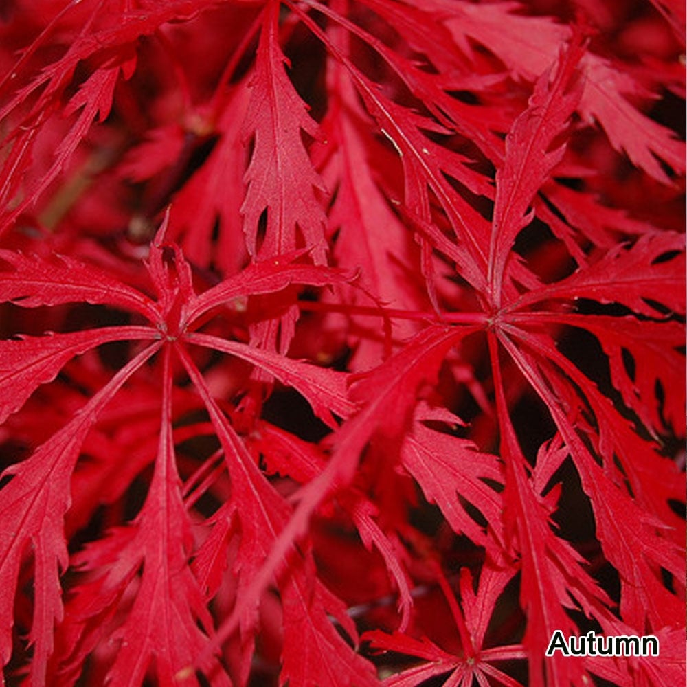 Acer palmatum dissectum 'Garnet' has feathery, heavily dissected foliage that resembles the colour of a deep garnet stone throughout the spring and summer. It holds its colour well compared to other red Japanese Maples, before turning shades of scarlet for a striking display in Autumn.