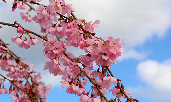 A stunning selection of Weeping Cherry Blossom trees with long hanging branches that once a year become awash with a cascading shower of blossoms. If this isn't enough, their mid-green leaves turn beautiful tones of orange and red in the Autumn, providing interest for additional months of the year....