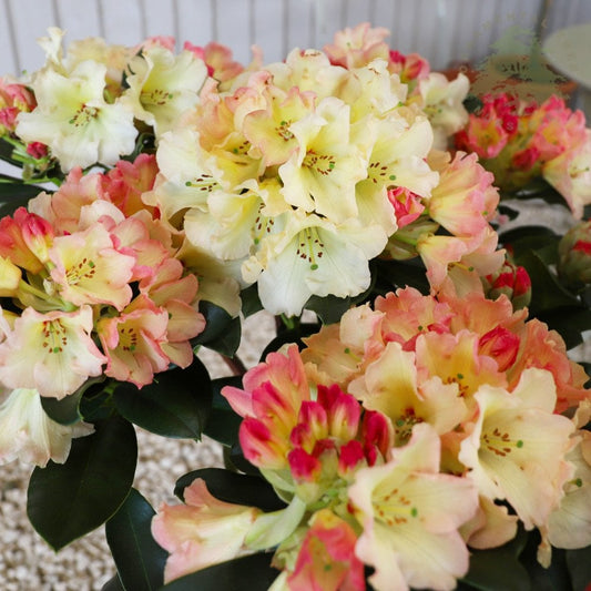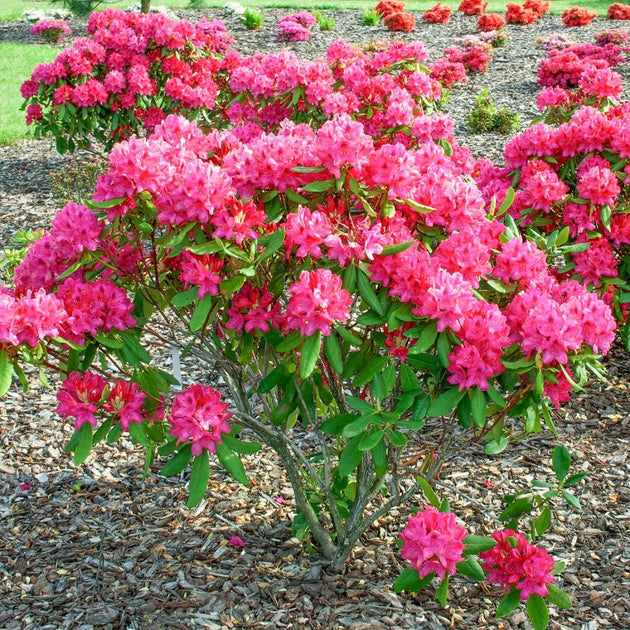 The vibrant red flowers of Rhododendron ‘Nova Zembla’ make this shrub an ideal choice for adding a hint of exuberance to any garden. Appearing in mid to late spring, Nova Zembla’s flowers are trumpet-shaped and grow in large, round trusses for a gorgeous floral display. The insides of its petals are complemented by a deep, speckled red and bright yellow anthers. Like all evergreens, this hardy shrub will keep its dark green, elliptic leaves through all seasons. The year-round appeal and high tolerance to extreme temperatures make Rhododendron ‘Nova Zembla’ a very popular choice.