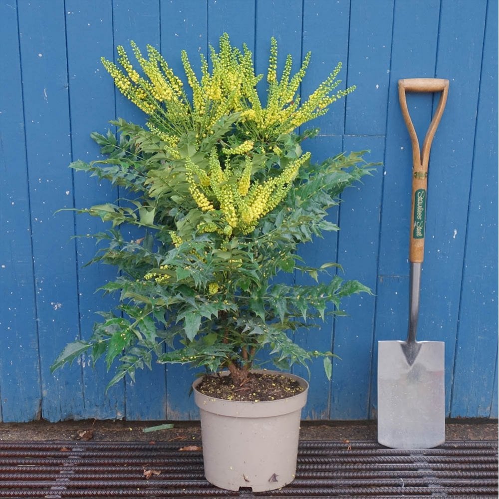 Brighten up your winter garden with Mahonia × media ‘Winter Sun’. From autumn into winter, it produces upright racemes of bright yellow flowers that rise above the spiny, pinnate evergreen foliage. The flowers are later followed by clusters of decorative blue-black berries, extending the seasons of interest.