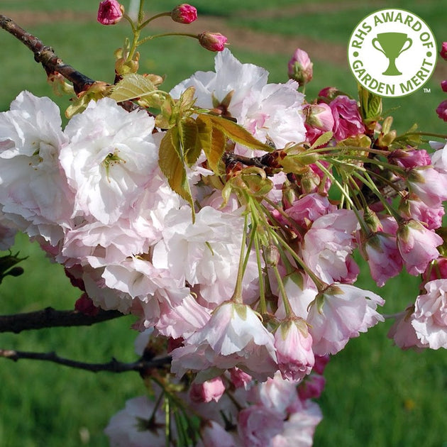 Considered one of the finest blossom trees available, Prunus 'Shogetsu' also goes by the names Prunus Shimidsu and Blushing Bride. The name Blushing Bride perfectly describes the delicate looking, large, blousy double flowers that hang down in big bunches from April-May, opening pink and fading to bright white as the season progresses. It is also a very popular choice to give as a wedding gift.
