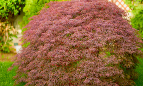 Weeping Japanese Maple trees are renowned for their boldly-coloured, yet delicately shaped lacy foliage. The trees have a graceful cascading form, with mature specimens taking on a more solid dome shape and sometimes being described as "mound-forming".