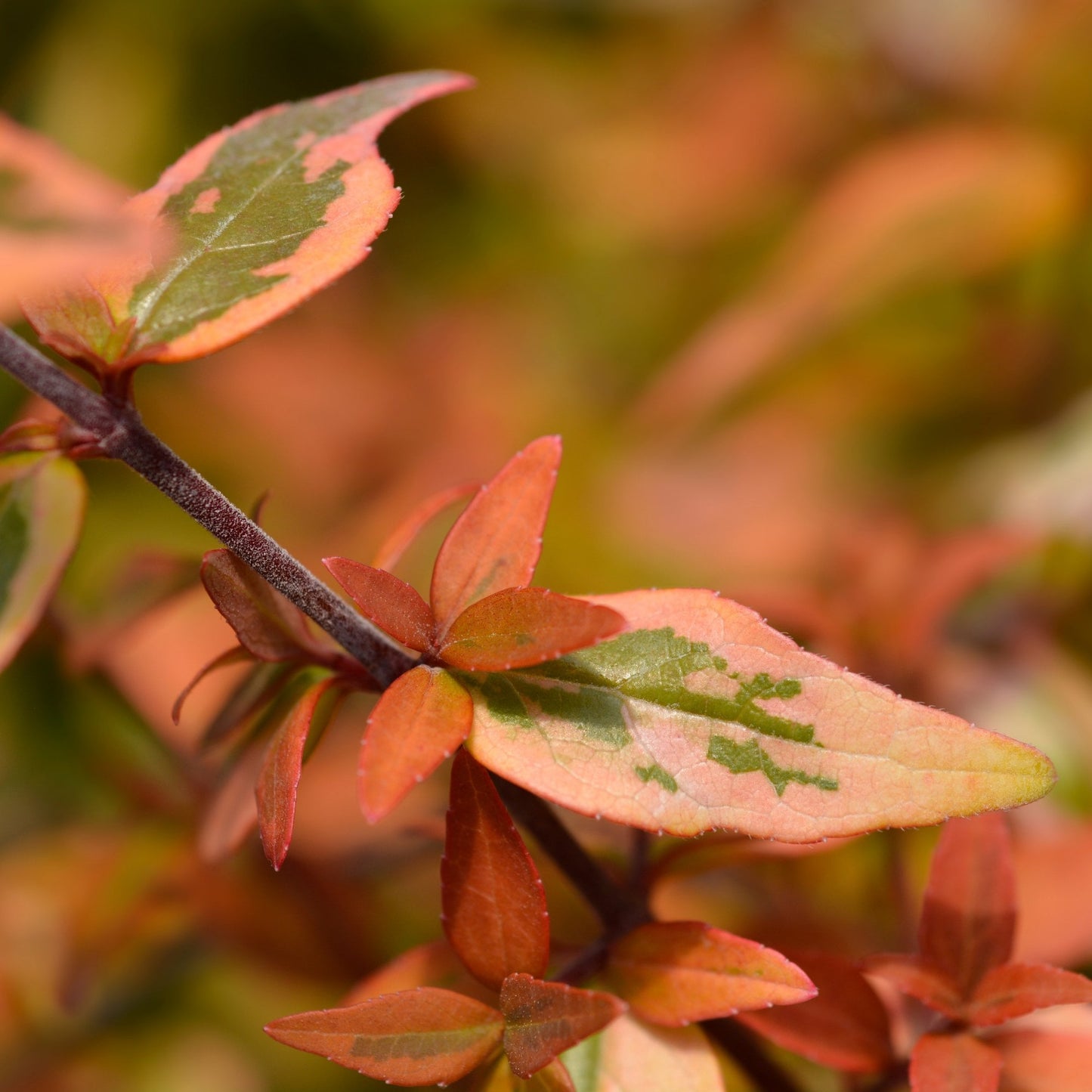 Abelia 'Kaleidoscope' is an impressive dwarf evergreen shrub with a colourful display of variegated foliage. The leave colours transforms throughout the seasons from a vibrant yellow and green to rich orange and red hues in the autumn. Elegant, white bell-shaped flowers that bloom in summer and autumn perfectly complement the foliage. Due to its size, this plant is well-suited for container planting, perfect for small gardens.