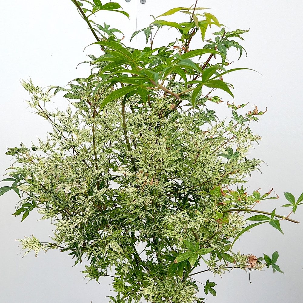 Acer palmatum ‘Uki-gumo’, poetically named ‘Floating Cloud’, is a captivating Japanese Maple with almost painterly variegated leaves. The five-lobed leaves emerge in crisp white with bright green flecks in the spring. As it matures through the summer, the leaves develop soft pink-tinged edges, before transforming into vibrant hues of bright peach and deep red in the autumn.