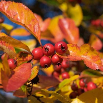 Amelanchier lamarckii is a tough yet elegant, small bushy tree with star-shaped white flowers. April brings a profusion of these flowers, along with bronze-tinged green young leaves, that turn a striking red colour in autumn. Edible purple-black berries ripen in summer and are popular with hungry birds.