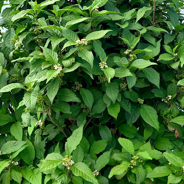Callicarpa bodinieri 'Magical Snow Queen' is a deciduous shrub from the beautyberry family, reaching an approximate mature height of 1.75m and spread of 1.5m. In summer, it produces delicate pink flowers from July to August, followed by eye-catching clusters of glossy white berries that provide standout interest in the garden and floral arrangements.
