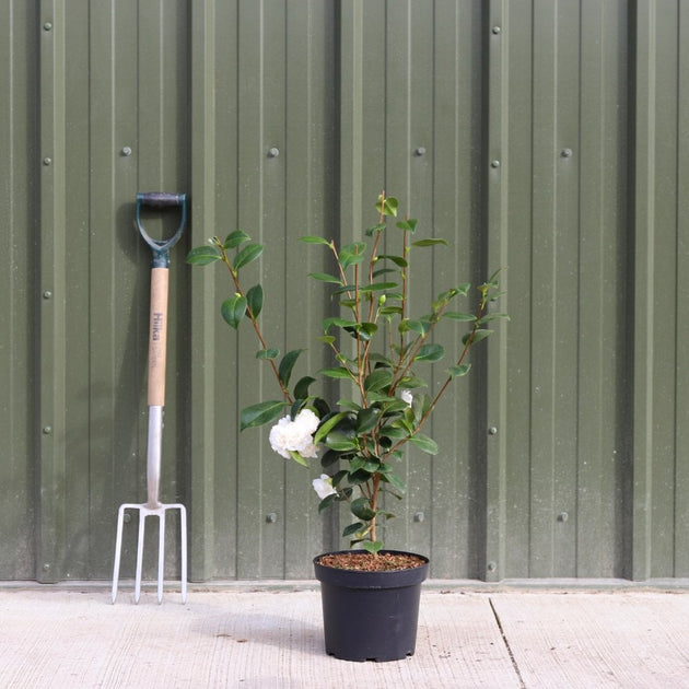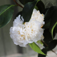 Camellia japonica 'Powder Puff' is an elegant, flowering evergreen shrub, producing large, creamy white double flowers from around March—a little later than other camellia varieties. The flowers are ruffled at their centres and their pure white colour contrasts wonderfully with the glossy evergreen leaves.