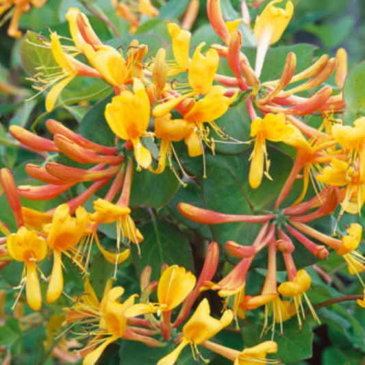 Campsis × tagliabueana 'Madame Galen' is an award-winning climber featuring colourful orange-red trumpet-shaped flowers.