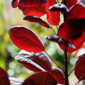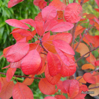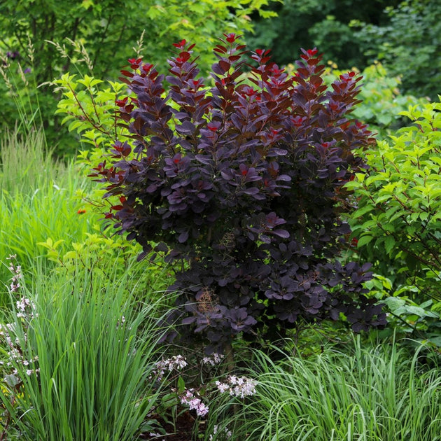 The rich maroon-purple, oval leaves of Cotinus coggygria ‘Royal Purple’ create a striking presence through summer, turning a brilliant red in autumn for a truly vibrant display. As if the foliage weren’t showy enough, from July to August the plant produces masses of airy, pinkish-purple flower plumes that give the illusion of soft, drifting smoke around the shrub — an effect that inspires its common name, the Smoke Bush.