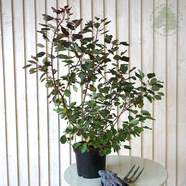 Cotinus 'Dusky Maiden' is a deciduous shrub with a bushy habit. This shrub is known for its incredible display of colour throughout the seasons. Plumes of purple-pink flowers which resemble puffs of smoke are complemented by tiny of small yellow flowers which bloom on the gorgeous dark pink stems. The shrub also produces circular, rich, deep purple leaves which transform into fiery sunset tones of red and orange in the autumn. This shrub is an excellent choice for bringing a unique focal point to flower border. It is also slow growing, so would be suitable in a container within smaller gardens.