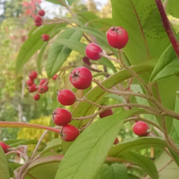 Cotoneaster x watereri is an attractive semi-evergreen Cotoneaster tree. Clusters of white flowers adorn the branches in summer and attract pollinators. In autumn, red berries provide colour and invite birds to the garden.