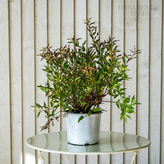 Deutzia × rosea Yuki Cherry Blossom is a small deciduous shrub with a very compact habit, typically reaching a height and spread of just 1m. It features dark green, ovate-shaped leaves approximately 7.5cm in length. In spring, it produces panicles of small, attractive flowers—some with pink petals edged in white, and others with white petals tinged with soft pink on the inside. Its foliage turns unique shades of purple and bronze in autumn, adding seasonal interest to the garden. This shrub thrives in moist but well-drained soils and prefers a position in full sun to partial shade.