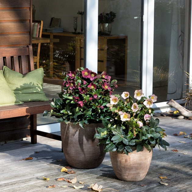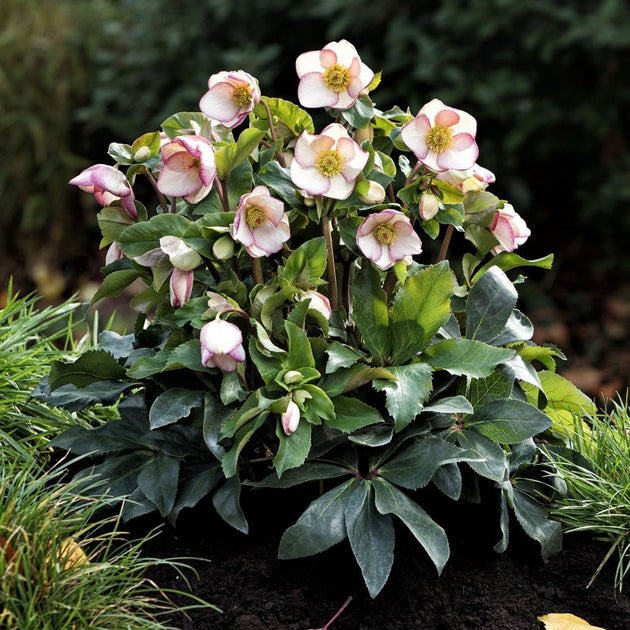 Helleborus HGC® Ice N Roses® Picotee is a vigorous evergreen perennial with an upright habit, reaching a height and spread of 60 cm. Its dark green, leathery foliage provides a striking contrast to the stunning bicoloured flowers, which are white with bold dark pink edges. These eye-catching blooms appear from winter through to spring, bringing vibrant colour to the garden during the colder months. This hardy plant thrives in full sun to partial shade and prefers moist but well-drained soils, making it a great choice for long-lasting seasonal interest.