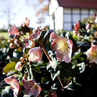 Helleborus HGC® SR Maestro® is a hardy semi-evergreen perennial with a clump-forming habit, typically reaching a mature height and spread of 50cm. It features leathery, silver-green leaves emerging from branched stems, creating an attractive backdrop for its stunning cup-shaped flowers. These creamy-pink blooms appear from winter through spring, deepening to a richer pink as they mature. Maestro thrives in moist but well-drained soils and prefers a partially shaded position, making it a perfect addition for adding winter and spring interest to your garden.