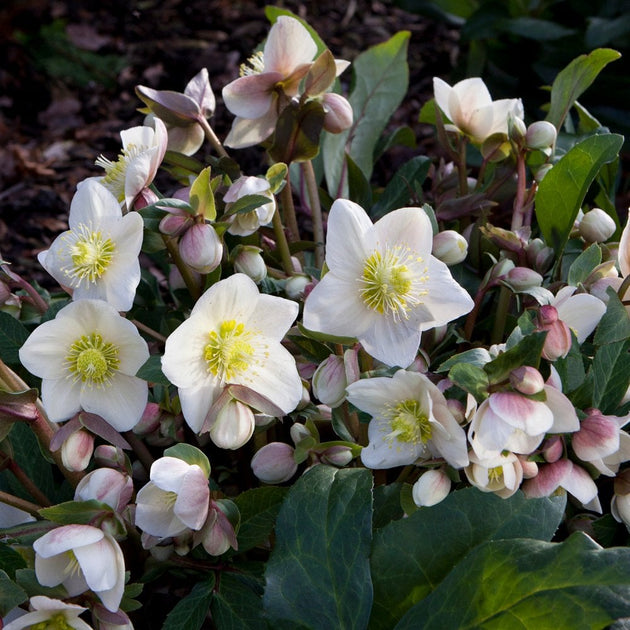 Helleborus HGC® SR Snow Dance® is a hardy evergreen perennial featuring a compact, clump-forming habit that typically reaches a height and spread of 40cm. Its dark green, leathery foliage showcases a subtle marbled pattern, adding visual interest throughout the year. From November until spring, it presents a stunning display of large, outward-facing white flowers that emerge from elegant pink buds. This lovely hellebore thrives in full sun to partial shade and prefers moist but well-drained soils, making it a versatile addition to your garden that brightens the winter landscape.