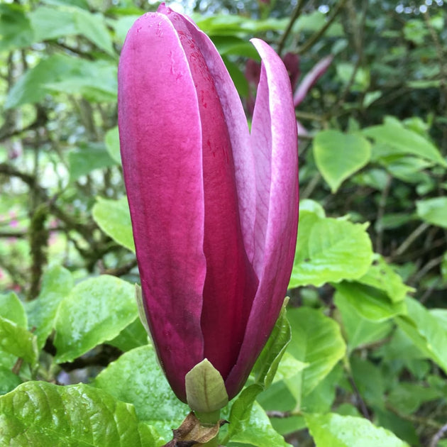 Magnolia liliiflora 'Nigra' starts flowering earlier than most other Magnolias, making it a great choice for spring interest. It has gorgeous glossy, dark/mid-green ovate deciduous foliage up to 20cm long. This small Purple Magnolia has the RHS AGM and is an ideal small garden tree or can be kept in a container. We recommend planting in well-drained soil in a sheltered position in full sun or part shade for the best results.