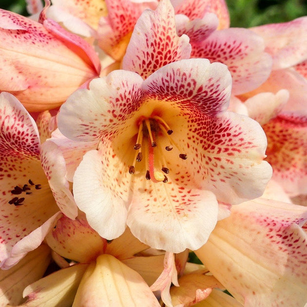 Rhododendron 'Firelight' is an unique hybrid shrub that blossoms beautiful cream and pink trumpet-shaped flowers, speckled with vibrant red dots. The flowers grow in beautiful trusses of up to 14 blooms each, creating an impressive...